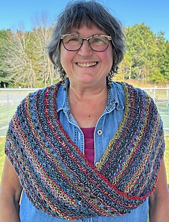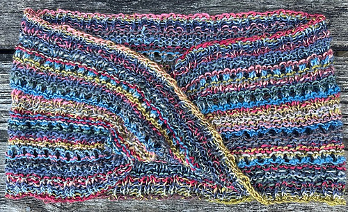 One skein (273 yards/250m) of Louisa Harding, Amitola Grande, 80% wool/20% silk bulky weight yarn. Or another yarn the same weight. Sample color is #301, Mona Lisa. Size: 10” deep x 42” in circumference. The gauge is 3 sts./in. 5 rows/in.