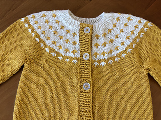 The Flutterby is a baby / toddler / young child’s cardigan that’s knitted top down. At the underarms stitches are placed on holders for the sleeves, then the body is continued in one piece. The sleeves are then worked top down too and are seamless.