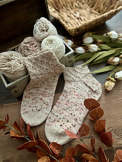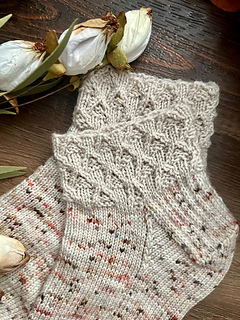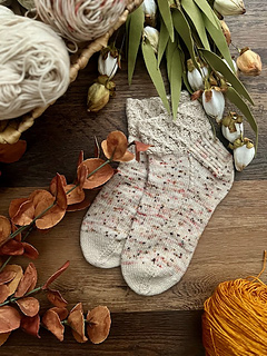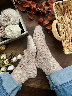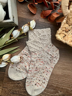 These socks feature a delicate, lattice-style lace cuff that adds a touch of vintage charm, seamlessly transitioning into a smooth stockinette body. Designed to showcase your favorite hand-dyed yarns, this pattern creates a romantic, textured look that is as enjoyable to knit as it is to wear.