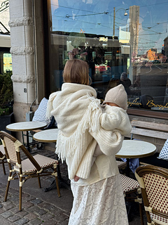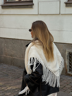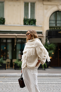 You can use 5 - 6 skeins of wool in Holst Cielo, 6 if you want the fringes longer or thicker and 5 if you want them shorter or without fringes completely
