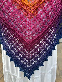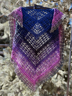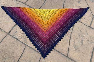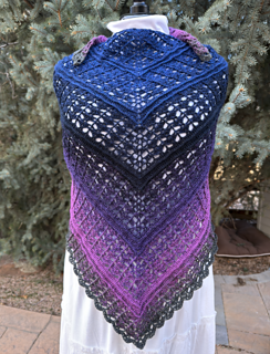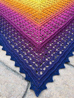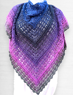 The pattern gradually builds from the center outward, alternating stitch textures that create a striking geometric lace design. With a fingering-weight gradient yarn, the shawl develops stunning color transitions as it grows.