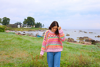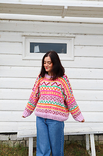 It features stranded colourwork design throughout the whole piece and seamless construction. It’s worked bottom-up with a comfy 2x2 ribbed edge — no sewing required.