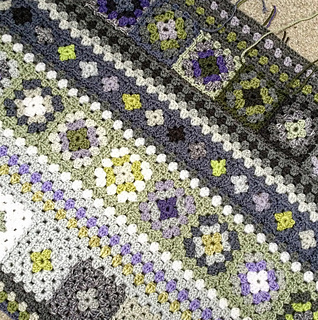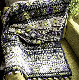 It is rectangular in shape, made up of strips of granny squares and granny stripes.