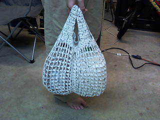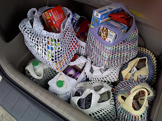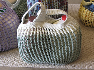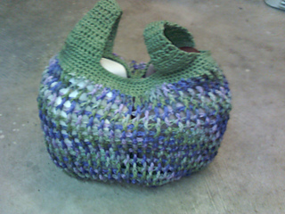 If you use a good strong cotton yarn that doesn’t stretch much, the bag should be able to hold two gallons of milk, or up to 30 pounds of canned goods. They really stretch a lot and nothing falls out. Just wash them with jeans and towels and they shrink back up to their original size. They will last for years.