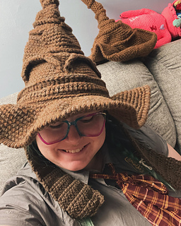 Sort into your own magical house with This Hat of Knowledge! Made to fit an average 22” head circumference depending on tension.