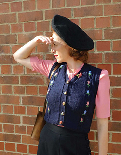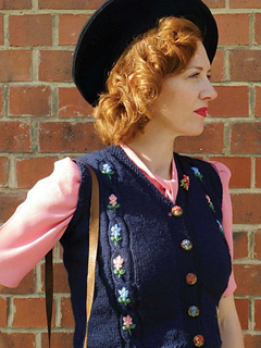 The waistcoat is characteristically short, in keeping with mid-1940s style, perfect for the look with blouse and trousers (you can even make the charming pompom slippers in the original pattern, to complete the cosiness of the outfit). There are simple cables on the front and back, with just the front ones embroidered in the pattern, though the back could also be embroidered if desired. In the recreated model, the embroidered flowers were inspired by the pink and blue gentians of the vintage Austrian buttons, carved from horn. These stand out against a dark navy blue as the main colour, knitted here in an economical wool mix or a 100% wool if preferred.