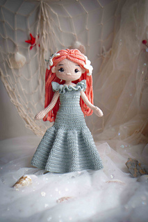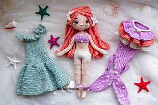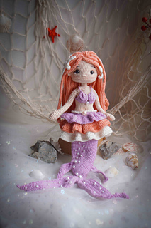 The pattern includes:: 2 beautiful outfit sets for the mermaid doll (a seashell top and an optional ocean-style dress)