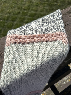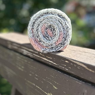 Ikigai Fiber, Chibi Paka Chunky (75% superwash merino, 25% baby alpaca; 55 yds/50m; 50g). 2 hanks Rosé (color A), 3 hanks Iron Twist (color B), 3 hanks Matcha Latte Twist (color C)