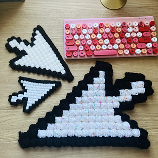 A 90s cursor crochet project with a mix of textured and shaping techniques. Using a 4 mm hook and acrylic yarn, the finished piece measures approximately 25 cm × 16 cm / 9.8 in × 6.3 in. The final size can vary depending on your yarn, tension, and hook choice.