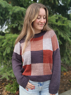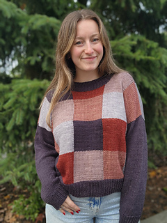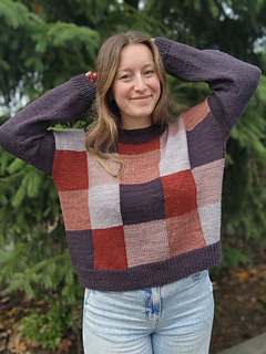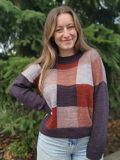 This design was inspired by the beautiful palette of autumn tonal yarn from Ashleigh of Sewrella. The main body of the sweater is knit in patchwork squares, using the intarsia technique to create squares of different colours. The body is knit bottom up in the round, then split at the armpits and worked flat for the front/back top portion. The sleeves are picked up and knit in one solid colour, which matches the hem and collar. The fit for this design is intended to be an oversized, boxy fit, perfect to throw on over some other layers to stay cozy! It is a size inclusive design, written in 9 sizes from 34.5-72.5 inch / 86.5-181 cm finished bust circumference. This design is intended to be worn with about 15-25% positive ease.