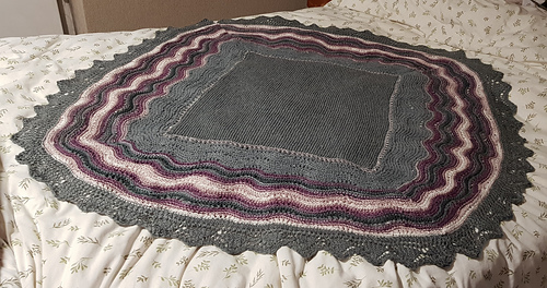 Pattern is written and starts with centre square, scalloped border (knit in 4 pieces) and edging (knit in 4 pieces) which are then sewn together and then “dressed” or blocked to 44” finished size.