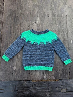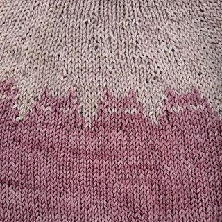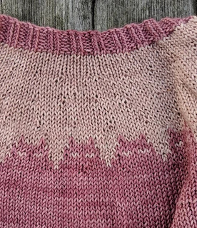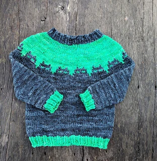 • The smaller, green and nearly black sweater was knit in Unbelievawool Nylon Merino in Dark Grey (MC) and Emerald (CC). • The two-tone pink cardigan is in Belle Epoque (MC) and Smitten (CC), by The Wool Barn