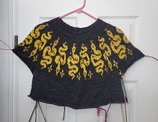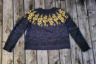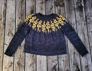 This jumper pattern has a loose fit. It comes in five different sizes. It is a top-down, circular yoke featuring stranded colorwork.