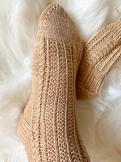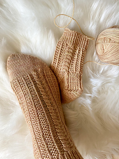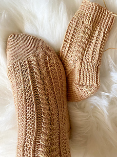 The Snow Socks are knitted from the cuff down towards the toes. They are started with a Long-Tail-Cast On and worked with a 1x1 ribbing cuff. The beautiful cable pattern is familiar to my Snow Hat pattern. They come with round French heels and end with a round toe.