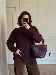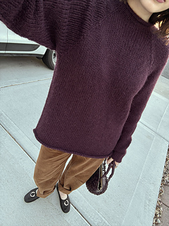 The Sugarplum Sweater is an oversized, top-down sweater worked seamlessly in the round. The sweater features a clean stockinette body, classic raglan shaping, and a relaxed rolled neckline and hem. The sleeves are shaped with centered underarm decreases for a symmetrical, tapered fit.
