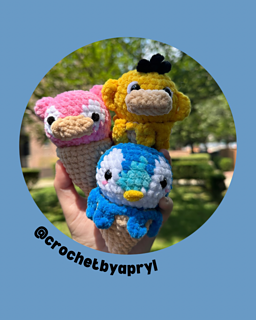 The Water Types have arrived to the Ice Cream Cone series! This PDF Croceht pattern includes instructions for making your own Banana (inspired by Pysduck), Cotton Candy (inspired by Piplup), and Bubblegum (inspired by Slowpoke) ice cream cones.