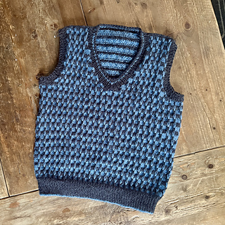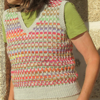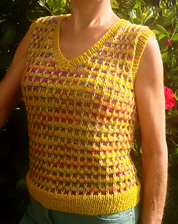 The Xanadu tank top is knitted bottom up until the armholes and then the fronts and back are worked separately. The texture and colours come from using a plain and variegated yarn combined with slipped stitches.