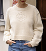 Sample 1 is worked with Fable - gauge 18 sts over 24 rows - in colour Feather (natural white) in size 4, with the option to add 5 repeats at sleeve increases. It is worn with 23 cm/9.25” of positive ease.