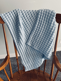 Knit in one piece, this blanket is a well-loved choice for baby blankets and throws. The stitch pattern shows best when worked in a solid-color yarn in a light to medium shade. The design works well with many worsted #4 weight yarns in a variety of fibers, including wool, cotton, and acrylic.
