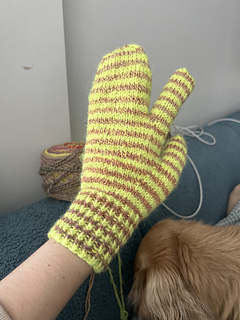 Recommended for a beginner with a bit of experience and knowledge of mitten construction. The pattern offers a good chance to practice different stitch decreases and increases. These gloves are knit in the round from bottom to top with a DK to light worsted weight yarn or sport and fingering weight yarn held together (as in sample).