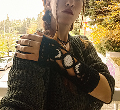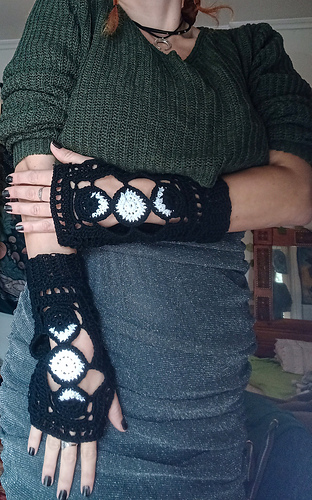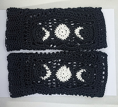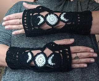 Fingerless Gloves with a mystical three moon design. Based on my pattern “Three Moons Applique”, which is also included in this download. If you only want to buy the applique, search for it on my Etsy shop, in the Crochet Applique Patterns section.
