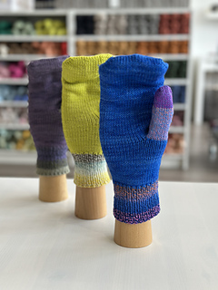 These mittens are knit starting with the fingertips. The thumb is worked using the afterthought method.
