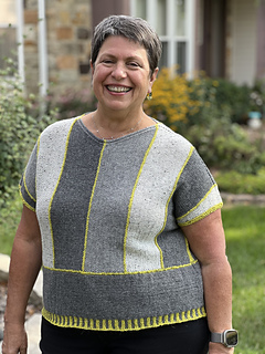 The top part of the tee is made with left and right pieces knitted flat sideways, from the sleeves to the centre-line of the tee. The sleeves are shaped by German short rows, then stitches are added with Cable cast on to create the front and the back. A shoulder detail is created while knitting the front and back as one piece. The left and right pieces are joined at the centre-line with Russian grafting with a crochet hook. Sides are joined with horizontal stockinette seaming. The bottom part of the tee is worked in the round in reversed stockinette stitch and 1x1 rib, or stockinette stitch and 1x1 rib from the reverse side. A contrasting colour is used for binding off.