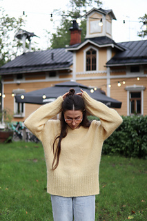 Neule on malliltaan hyvin väljä. Kuvan henkilön rinnanympärys on 85 cm ja hänellä on yllään koon 1 neule, jonka rinnanympärys on 114 cm. Paita on sarjoitettu neljään eri kokoon, joista voit valita itsellesi mieluisimman.