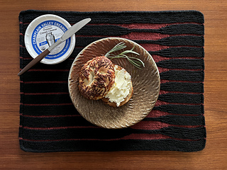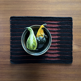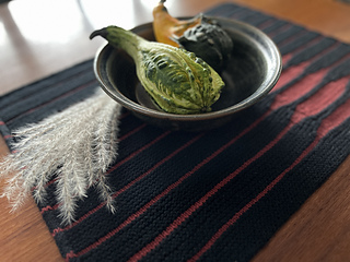 DESCRIPTION: The Tintype Placemat brings architectural elegance to your table setting with its signature elongated hexagonal shapes positioned in asymmetric composition. These recessed “windows” create visual depth and textural interest, transforming a functional piece into a work of art. Part of the Tintype Collection, this pattern continues my exploration of short-row pattern motifs, showcasing how solid color pairings create bold geometric statements. The result is both modern and timeless: a piece that elevates everyday dining.