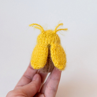 The body and head are knitted in one continuous piece in the round. The legs and ears are knitted separately and sewn on. The accessories are knitted flat.