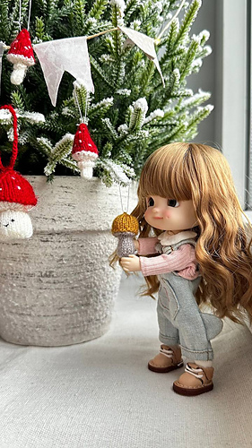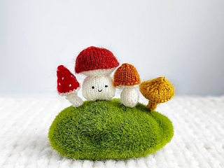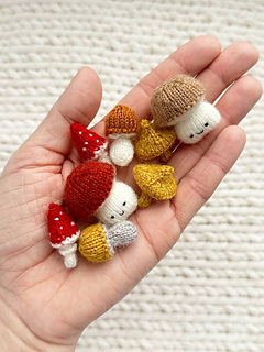 This knitting pattern includes instructions for making four mushrooms - Fly Agaric, Boletus, Honey Fungus, and Baby Mushroom - approximately 2–3 cm (0.7–1.1 inches) tall.