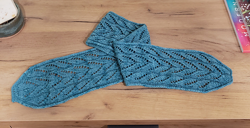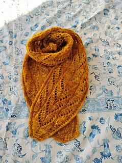 One skein of fingering weight yarn is enought for one scarf. It allowed me to obtain 28 full pattern repetitions in Dolly Baby yarn.