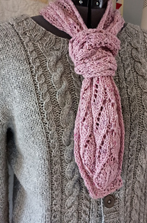 Tiny scarf starts with an I-cord cast on. Then you shape it with increases, make as long as you like with full pattern repeats, shape the end decrease, and finally use I-cord bind off to finish nicely.