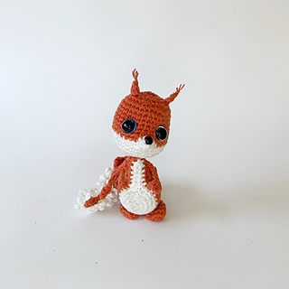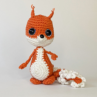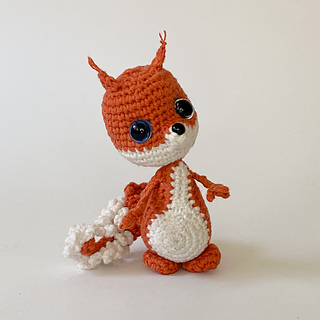 This tiny squirrel is a forest-inspired amigurumi project for intermediate crocheters. Standing about 9 cm tall, it features detailed shaping, expressive arms with tiny fingers, and a fluffy tail.
