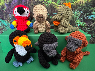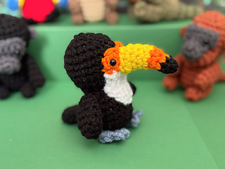 The Tiny Toucan is the 4th of 12 animals in the Little Amazon Mini Amigurumi Crochet Along. It joins the Mini Macaw from Day 1, the Little Capybara from Day 2, the Itty Bitty Iguana from Day 3, and the Mini Monkey from Day 4. It sits about 4” tall, with a big colorful beak, white throat patch, and blue feet.