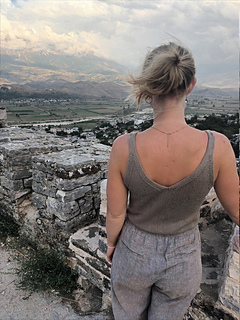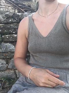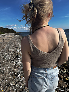 Classic summer top knitting pattern with beautiful double knitted edges. The top is worked from the bottom up. The body is first worked in stockinette stitch in the round. Then the work is divided into two – front and back – and double knitted edges are established on each side. The back is divided once more, and two triangles with double knitted edges are worked. The front is worked identically to the back.