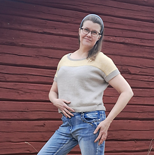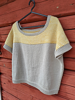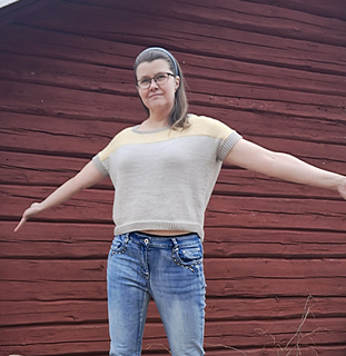 Merino-silkistä neulottu lyhythihainen pusero on miellyttävä suoraan ihoa vasten ja malliltaan rennon väljä. Alaosa on sileää neuletta, yläosassa käytetty linen stitch -neule muistuttaa kudottua kangasta. Se neuloutuu helposti yhdellä värillä kerrallaan silmukoita vuoron perään neulomalla ja nostamalla. Halusin paidan nimeksi jotain kudontaan viittaavaa yläosan mallineuleen vuoksi, ja niinpä siitä tuli Tiuhta.