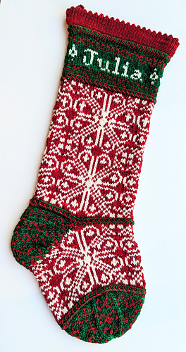 Enjoy knitting this heirloom Christmas Stocking that will bring joy for years to come! You can use the included colorwork chart of the Christmas Flower or customize the design by using Doodle Decks. Their 12 stitch repeat works easily with the pattern. I have also included letter charts so you can knit in the name of the special recipient. Stocking is knit from the top down and includes fanciful details of a picot cuff and Latvian braids.