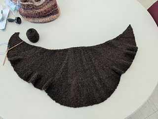 Shawl is knit in one piece from side to side with short-row garter-stitch ruffles on bottom edge and short rows shaping shoulders and back.