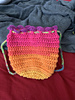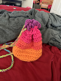 It’s a mini drawstring backpack, made to fit comfortably on a toddler. It is worked in the round. It is a fairly easy pattern using only half doubles, and puff stitch. If you want to make bigger you would just need to increase the bottom til it fits your preference. Then you would work the same repeat rows making sure to end up with an even number. I was able to make this small bag using a little more than half of a mandala cake. You can change colors every row or keep it solid. I used self striping yarn.