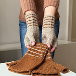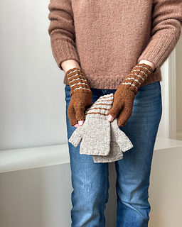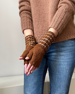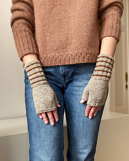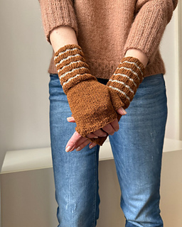 Toffee Mitts are simple mitts in Stockinette stitch, featuring a ribbed cuff with stripes. The mitts are easy and quick to work – perfect for a last-minute gift.