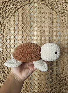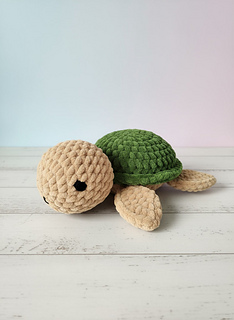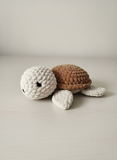 This pattern uses super bulky plush chenille yarn to create a small, soft turtle with simple shaping. The head and body are made separately and then sewn together, while the shell is worked as its own piece and attached last. All parts use basic stitches, making the project suitable for beginners.