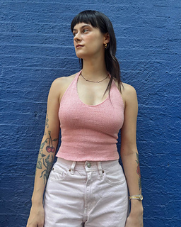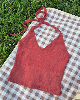 The Tomo Top is a flirty, tie-back halter perfect for summer days and warm nights. Knit in cool, breathable cotton, it features a deep V neckline, long ribbed ties at the neck, and clean stockinette shaping that hugs the body with just the right amount of negative ease. Designed with a playful Y2K aesthetic in mind, this top is perfect on its own or styled with low-rise jeans, mini skirts, or layered accessories. Worked flat through the straps and neckline before joining in the round, it’s a fun and satisfying knit that’s easy to customize for your ideal fit and length.