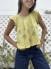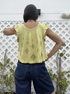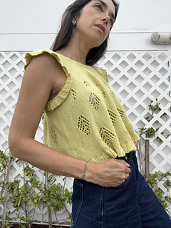 Un diseño pensado para acompañar los días luminosos de verano, ligero, versátil y fácil de combinar con jeans de tiro alto o faldas frescas. El motivo calado evoca hojas de limón en movimiento, aportando textura sin perder frescura.
