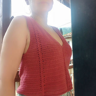 This is a crochet pattern worked top-down with a modular construction. It is worked flat. It starts by making the front yoke, then the back yoke and then the rest of the body is worked using turning rounds. To finish, borders are made in the hem, armholes and neck. It has no seams at all.