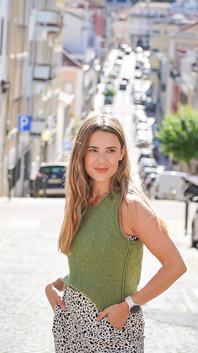 Nach dem Verbinden der Vorderteile wird das Vorderteil fertiggestellt und anschließend mit dem Rückenteil zur Runde geschlossen. Der Körper wird in Runden weitergestrickt und unter den Achseln durch ein kleines Muster ergänzt. Zum Abschluss werden Bündchen an Halsausschnitt und Armausschnitten angestrickt, die für einen sauberen und elastischen Abschluss sorgen. Alternativ kann das Tanktop mit einem I-Cord-Rand beendet werden.