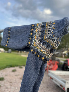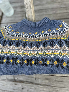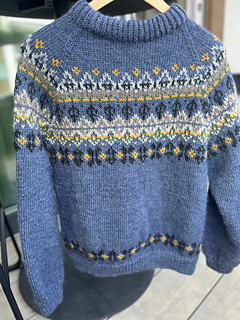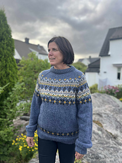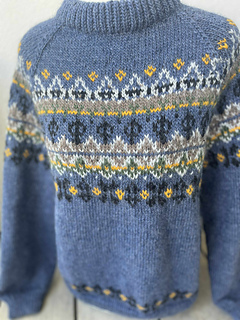 A beautiful Topdals sweater with raglan sleeves, worked in Viking Wool. The sweater is knitted from the bottom up in 6 colours. The pattern is available in 7 sizes. The sweater in the photo is size L.