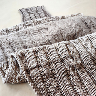 De belles torsades rythment l’ouvrage, séparées par des sections de côtes structurées qui ajoutent mouvement et équilibre à l’ensemble.