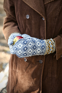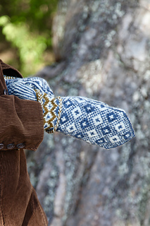 A traditional Scandinavian mitten, knitted in three colours and with sophisticated details like a thumb gusset and Latvian braid. Published in my book Stickning en värmande kärlekshistoria.