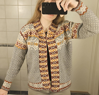 The body of the cardigan is knit flat from the bottom. The two sleeves are worked in the round, and increased gradually before they are sewn into the body. The body is separated and worked individually from under the armpit. The front and back of the yoke is knitted together. Two button bands are worked separately using double knitting. They are then sewn onto the body.